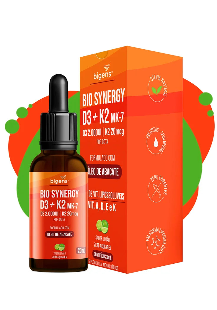 O Bio Synergy é um suplemento alimentar líquido que combina praticidade e eficácia, oferecendo vitaminas lipossolúveis A, D, E e K em uma fórmula de rápida absorção. Enriquecido com óleo de abacate para melhorar a absorção das vitaminas, cada gota contém 2.000 UI de Vitamina D3 e 20mcg de Vitamina K2 MK-7, permitindo uma dosagem flexível. Com sabor suave de limão, adoçado com stévia e sem açúcares ou corantes, é uma opção de alta qualidade para uma suplementação prática e eficaz.